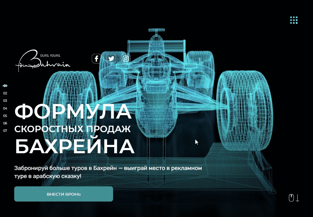 разработка посадочной страницы с информацией о гонках Формулы-1, а также о возможностях пляжного отдыха в Бахрейне. Запуск конкурса: те агенты, которые успешно совершают брони по направлению, могут участвовать в розыгрыше поездки в рекламный тур